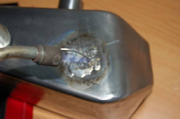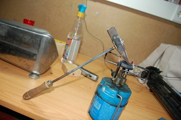– Primero calentamos el soldador casero, y luego lo apoyamos en el deposito en cuanto se funda lo ya existente ahí que le ponemos mas metal, de esta forma conseguimos que aumente la cantidad de metal.